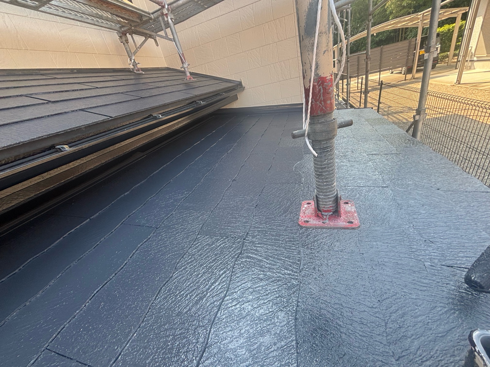 屋根材の状態によっては吸い込みが強い場合もあるため、塗布量や乾燥時間の管理も重要です。