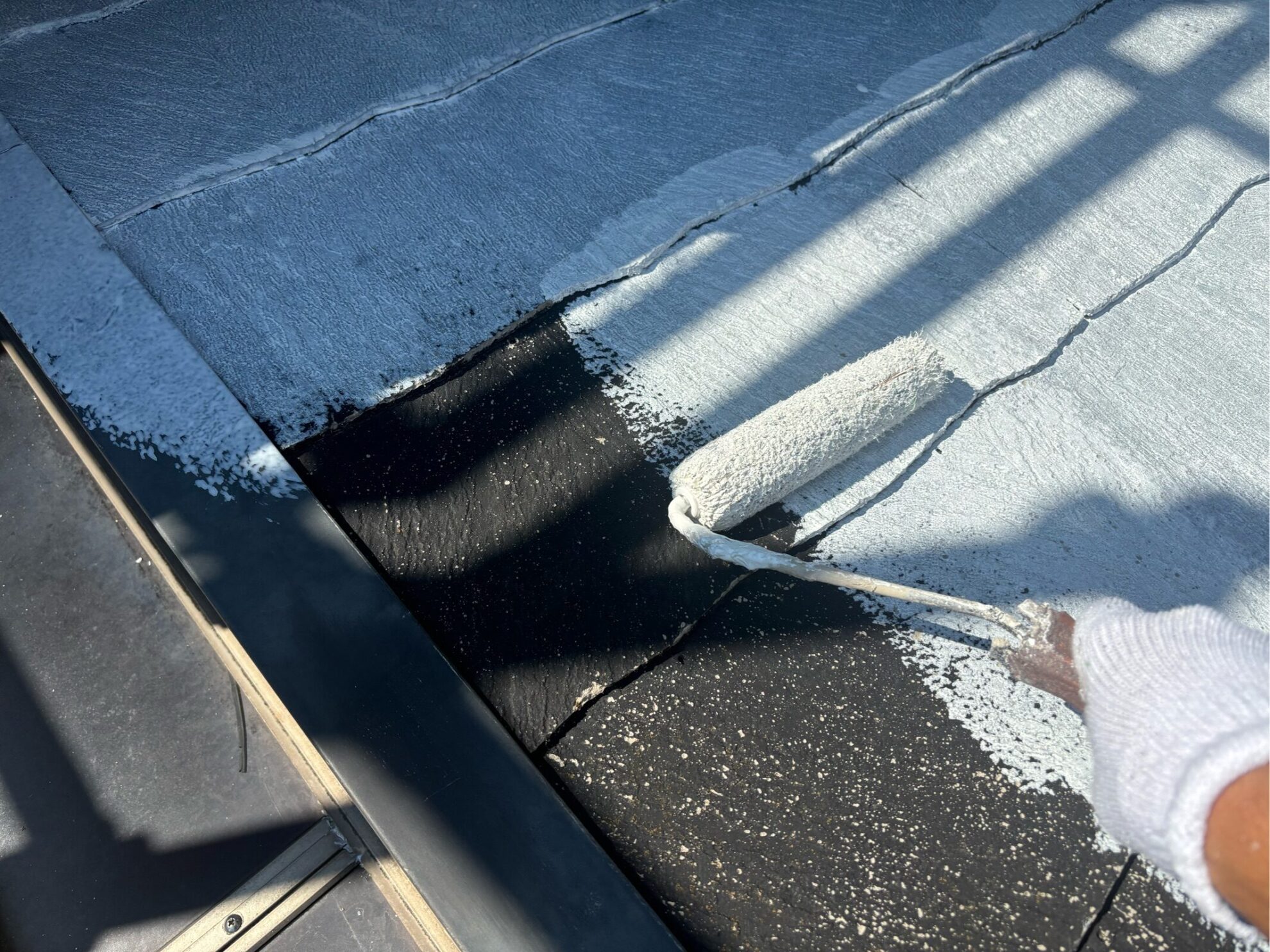 下塗りは、屋根材と塗料をしっかり密着させるための土台となる工程で、