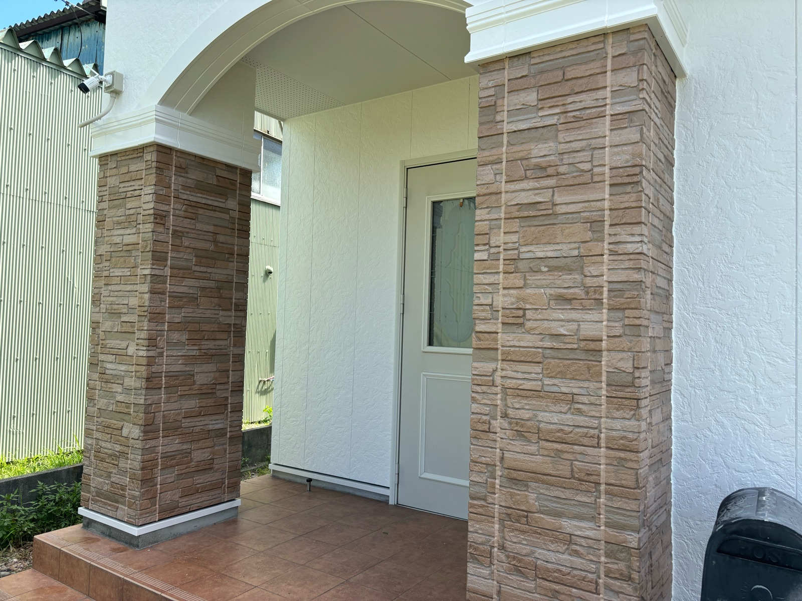 玄関先の柱は元々の外壁を生かし、クリア塗装をさせて頂きました。