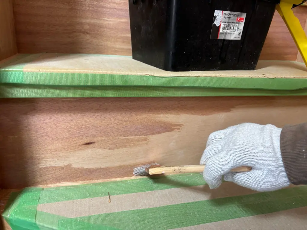 塗装は単に「色を塗る」作業ではありません。壁と天井、木枠、巾木などの取り合い部分は特に注意が必要です。見切りが綺麗に出るようマスキングを丁寧に行い、刷毛やローラーを使い分けて塗装を進めました。また、ドア枠や棚などの木部塗装も、素材に合わせた下塗り材を選定し、密着性と仕上がりの美しさを両立させました。