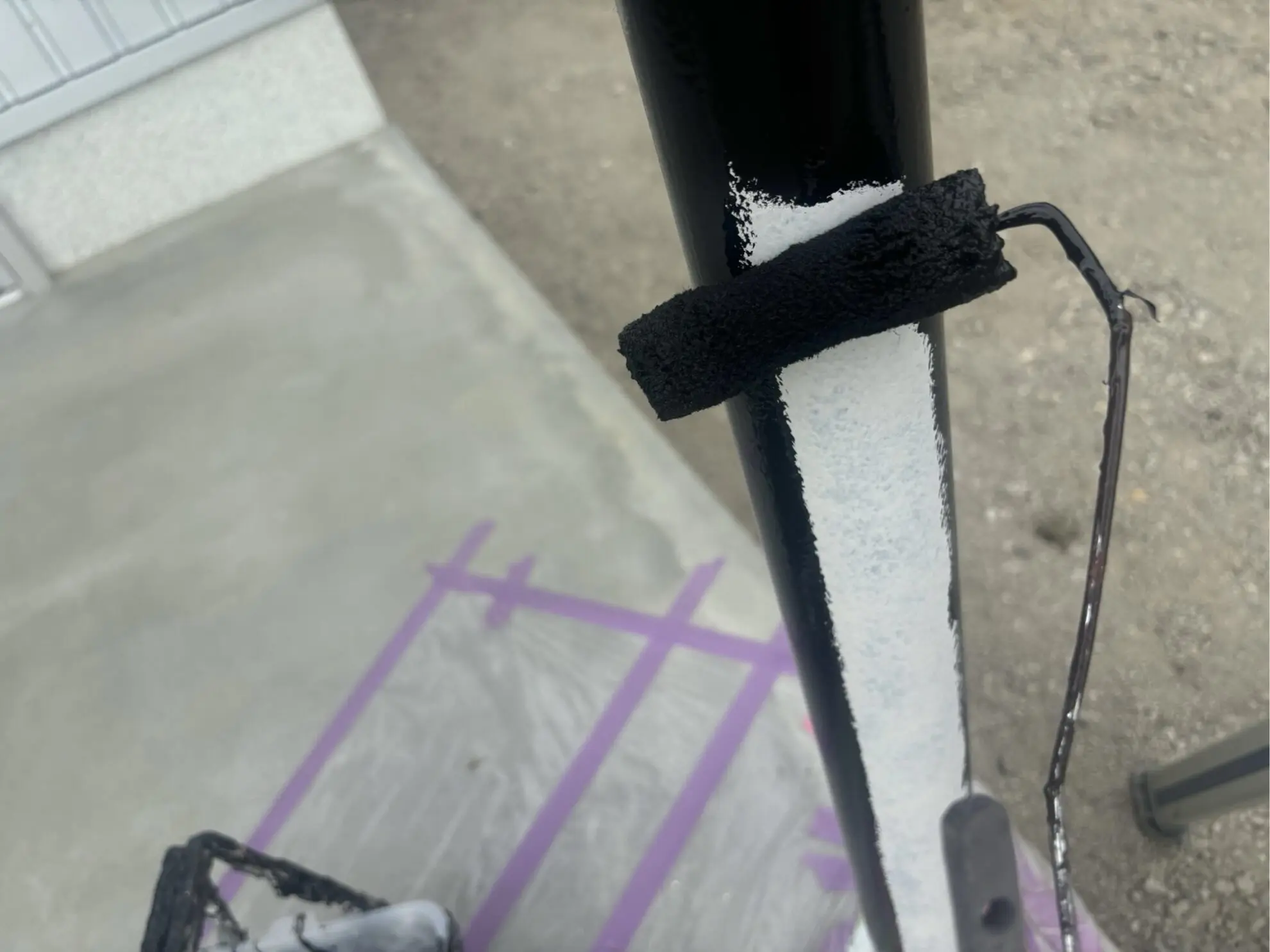塗装中の様子です。ローラーと刷毛を使い分け、細部までムラなく丁寧に施工しました。凹凸部分や角部分は特に塗膜が薄くなりやすいため、注意深く仕上げています。また、周囲の床や植栽は事前にしっかり養生し、汚れを防止しています。