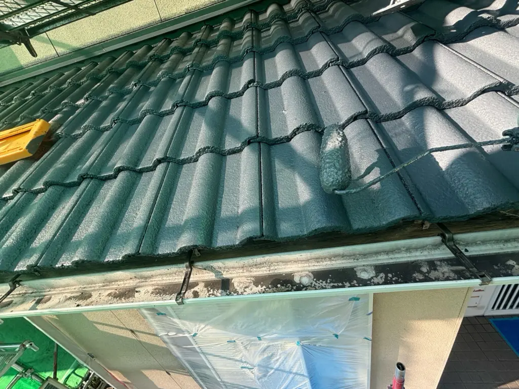 屋根塗装は、下塗り・中塗り・上塗りの3工程を丁寧に行うことで、美しい仕上がりと長持ちする塗膜が完成します。今回は、前回行った下塗りがしっかり乾燥したのを確認し、中塗りから作業をスタートしました。